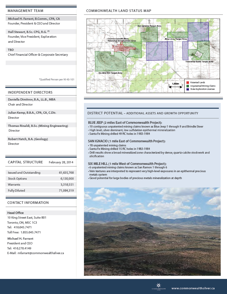 Michael H. Farrant, President and Chief Executive Officer of Commonwealth Silver commented, “Our acquisition of these surface and water rights was critical to the development of the Commonwealth Project, including permitting the Project entirely on private land and securing access to future water requirements. This acquisition serves to significantly de-risk the Project and moves us a huge step forward in terms of being able to execute on the mine plan as laid out in the preliminary economic assessment. We are extremely pleased with the progress being made on all fronts, including the Transaction.”