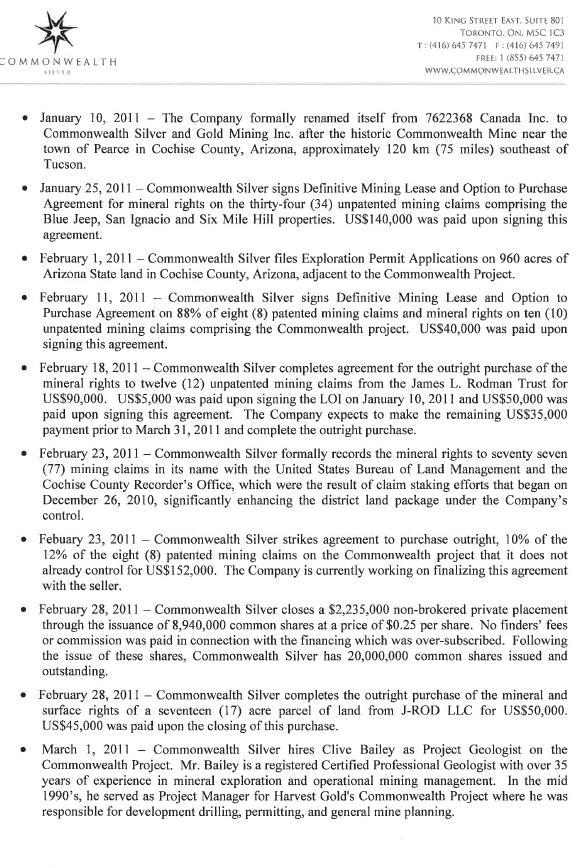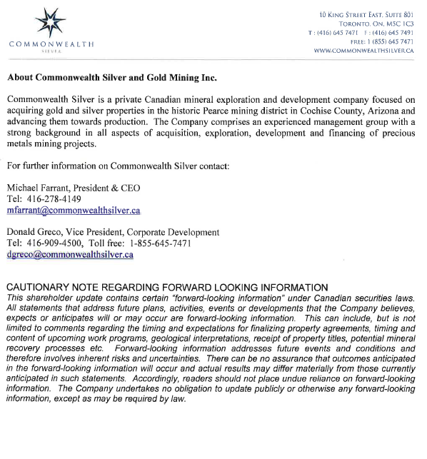 Commonwealth Silver and Gold Mining Inc. (“Commonwealth Silver” or the “Company”) is a private Canadian mineral exploration and development company focused on acquiring gold and silver properties in Arizona and advancing them towards production, including the Company’s 98% controlled flagship asset, the past-producing Commonwealth silver and gold mine. The Company comprises an experienced management group with a strong background in all aspects of acquisition, exploration, development and financing of precious metals mining projects.